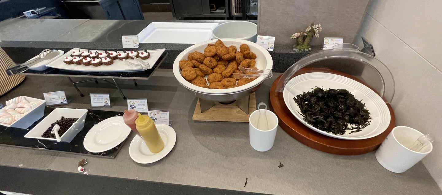 사진에는 없지만 우유부스 왼쪽에는 구워져 있는 와플과 딸기크림치즈가 있었습니다.