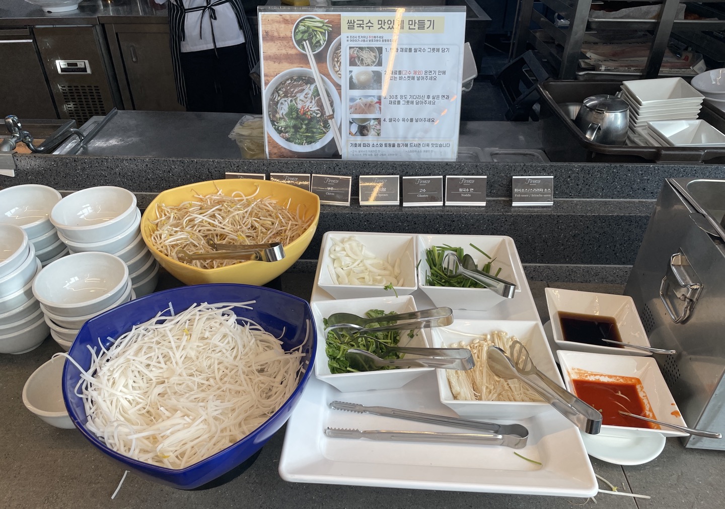그릇에 고수를 제외한 면과 채소들을 넣어 왼쪽 데치는 기계에 넣고 30초 뒤에 꺼내어 육수를 부어 먹는 방식인데