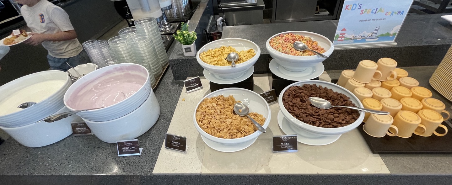 맨 처음 우유, 두유가 있던 곳의 오른쪽으로 이어져있는 곳에는 요구르트 2종류, 시리얼 4종류 어린이를 위한 메뉴가 준비되어 있었습니다.