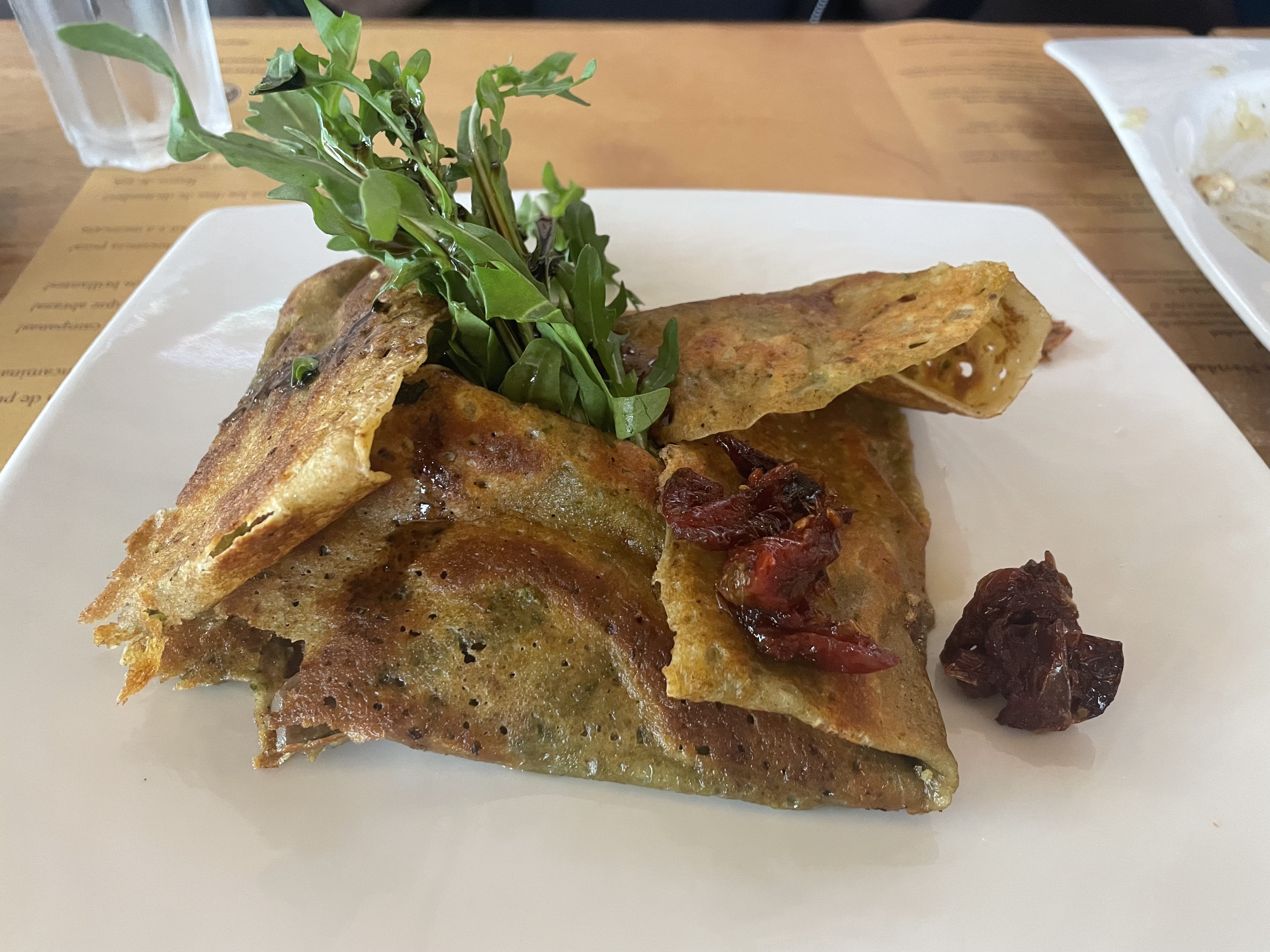 다른 메뉴보다 더 바삭하게 구운 크레페 속에는 양송이버섯, 선드라이드 토마토, 생토마토, 페스토, 모차렐라 치즈가 들어가 있고